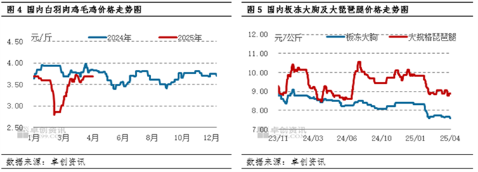 截至28日,白羽肉鸡产品综合售价8.85元/公斤,较上月均价走低0.06元/公斤,较去年4月均价走低0.49元/公斤;板冻大胸均价7.65元/公斤,较上月均价走低0.08元/公斤,较去年4月均价走低0.88元/公斤;大规格琵琶腿均价8.92元/公斤,较上月均价走低0.06元/公斤,较去年4月均价走低0.03元/公斤。月内产品价格呈现“跌-涨-跌走势”,产品价格随上游毛鸡价格波动而微幅调整。月内经销商补货心态整体谨慎,食品加工企业随用随采,整体市场需求疲软。供应方面,大规格产品供应不足,中小规格产品库存提升。