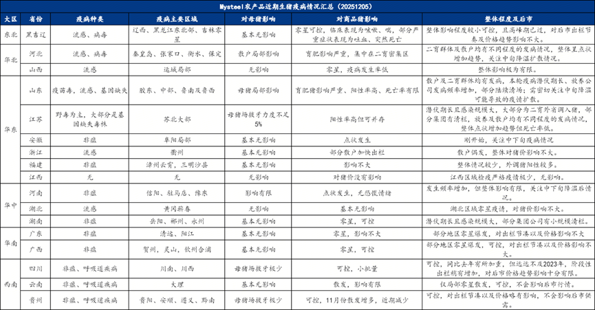 当前生猪疫情的局部加重,根据多方调研验证现阶段疫病情况不如23年底的严重,整体比去年加剧。山东临沂、泰安等市商品猪损失整体达10%(局部40%),河南驻马店、周口等地也呈点状扩散,230斤以上大猪受影响更甚。后续降温将进入疫情高发期,随气温降低也有扩散风险,两湖两广、福建浙江等地亦有抬头趋势,若后续引发更多养殖户加快出栏,将与集团厂补进度的出栏量、散户“压栏后集中释放”的大猪量形成叠加,最终在冬至前后放大供应压力,让当前的看涨情绪更快转化为实际利空,加速猪价下行拐点的到来。