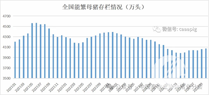 1、2024年10月末能繁母猪存栏4073万头,环比增长0.3%,同比下降3.2%,相当于正常保有量的104.4%,产能正常,处于绿色区域。