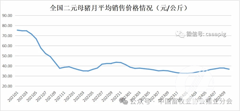 1、2024年10月份全国二元母猪销售价格36.84元/公斤,环比下跌2.4%,同比上涨7.9%。